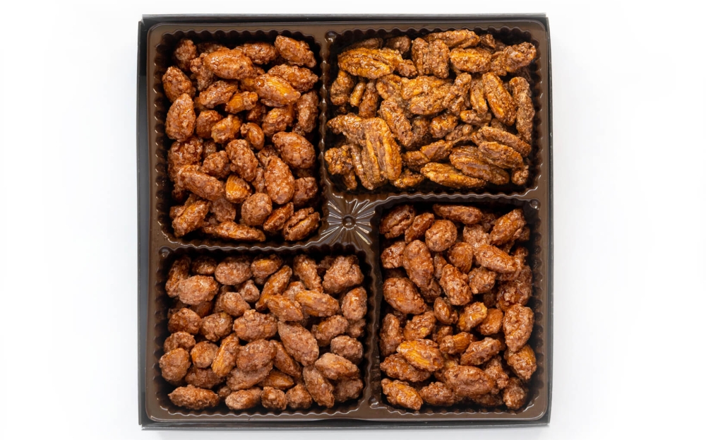 This 25-oz. gift box features our signature cinnamon glazed products; almonds, pecans, and cashews. Beautifully packaged in a Totally Nutz gift box and perfect for any gift-giving occasion. All gift boxes are roasted fresh and sealed in the box for maximum freshness.